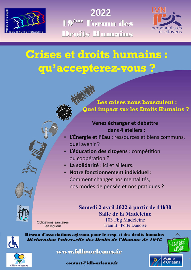 Le groupe LVN Personnalistes et Citoyens d’Orléans a organisé le 2 avril dernier un après-midi d’échanges et de réflexion dans le cadre du Réseau Forum des Droits Humains d’Orléans, intitulé "Les crises nous bousculent" .